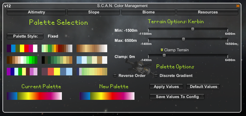 - The Clamp option can be used to set a cutoff below which only the first two colors in the selected palette will be used for the terrain height-to-color algorithm. This is especially useful on planets where there is an ocean, as it makes the transition from ocean to solid terrain more pronounced