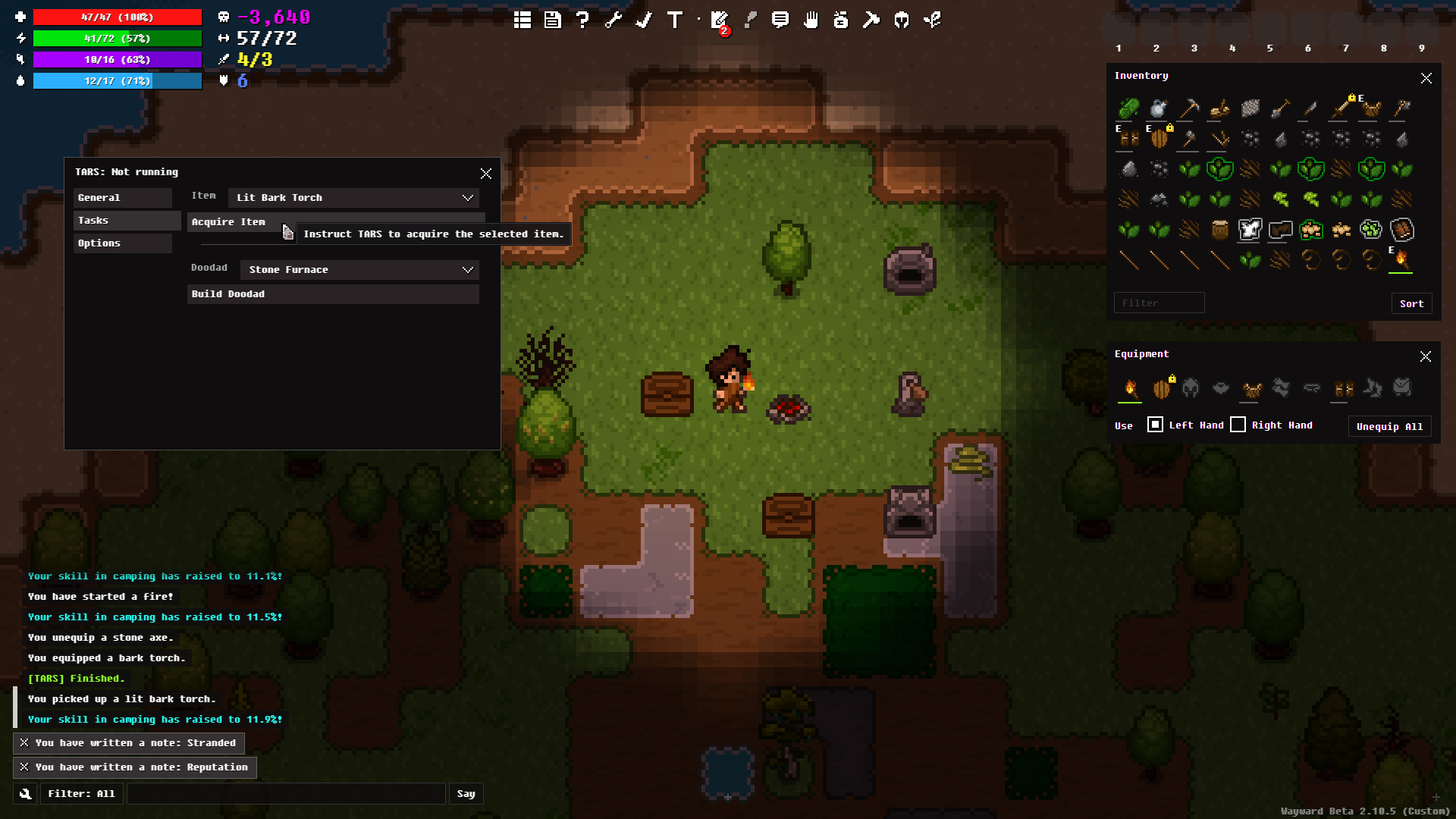 TARS is a bot that will play Wayward by itself, doing tasks such as gathering resources, setting up a camp, hunting, getting food/water, and more! It's named after the robot from Interstellar.