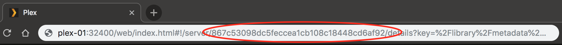 value is your local Plex server's UUID. You can find it in the address bar. In this example, it's867c53098dc5feccea1cb108c18448cd6af92