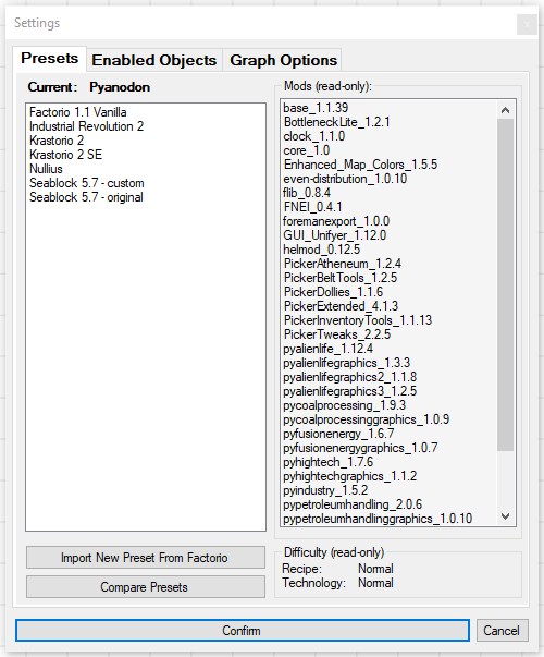 This is where you can set which buildings / recipes are to be enabled for your graph. Rather handy if you wish to plan for a specific science tier. Each building/recipe can be set manually by searching for it and enabling/disabling it, by loading a save file, or by selecting which science packs you wish to have available (any technology with the required science packs will be researched).