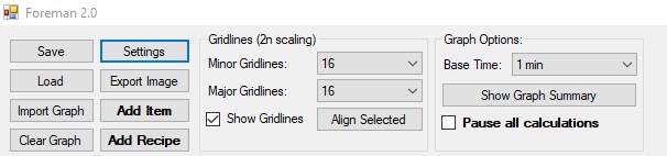 Additionally, be careful when exporting large graphs - this is a raster format instead of a vector one, so large graphs can quickly spiral out of control. It is highly recommended to plan out the factory in smaller sub-factories with a saved graph for each (that you can export as an image), and if you wish to plan the ENTIRE factory, then do so by importing the smaller graphs into the main graph, connecting all the nodes, doing your planning, and NOT exporting the final image (instead just saving the graph and navigating it within Foreman).