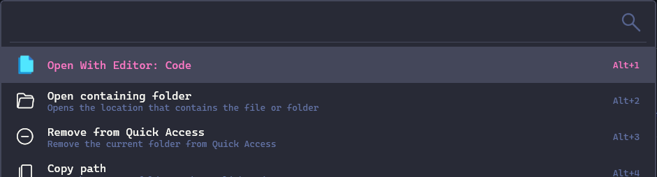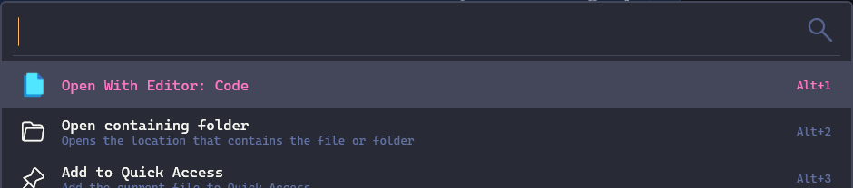 File Editor Pathsetting - everything works as before (context menu doesn't shows "Open with editor" command)File Editor Pathsetting is defined - everything works as before (context menu shows "Open with editor" command)Folder Editor Pathsetting - everything works as before (context menu doesn't shows "Open with editor" command)Folder Editor Pathsetting is defined - the context menu shows the editor for the folderEdit with code example for file