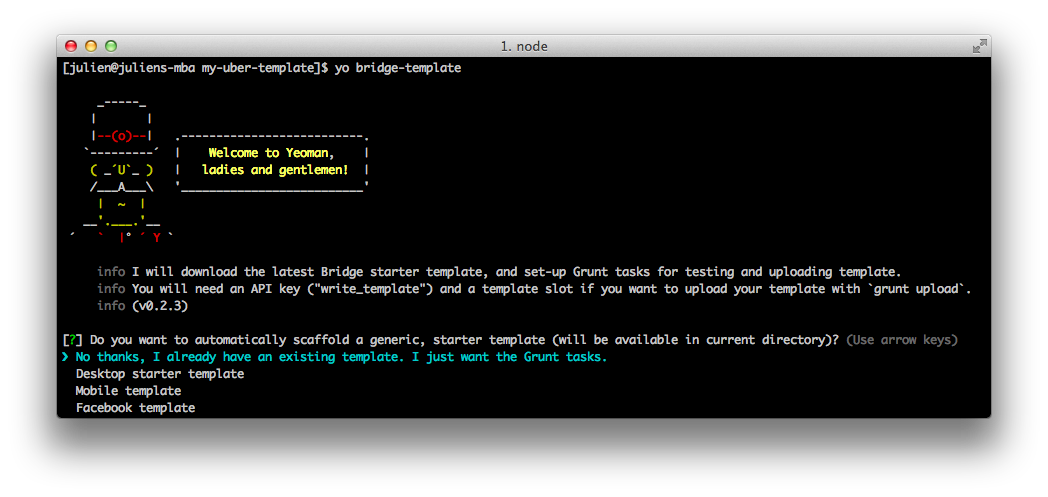 grunt check(alias forgrunt): lint js & css once, and output a report so you can fix them.grunt server: this will watch your changes in .css and .js files in the background, and automatically lint them as you save them. A notification will pop up if there is any error.grunt build: lint, concat, minify js & css, optimize images, and build a/_output/_template.zip, ready to be uploaded manually in Bridge Back Office.grunt upload: lint and prepare a build, then upload it in the template slot specified in the .bridge-apikey.json (generated byyo).