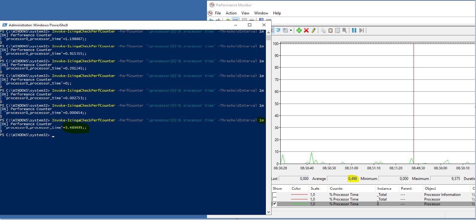 The Check-query is Invoke-IcingaCheckPerfCounter -PerfCounter '\processor(0)\% processor time' -ThresholdInterval 1m