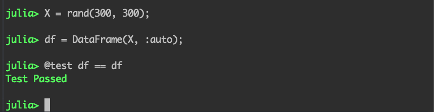 As an example, here's how a passing tests comparing two DataFrames looks in the REPL:
