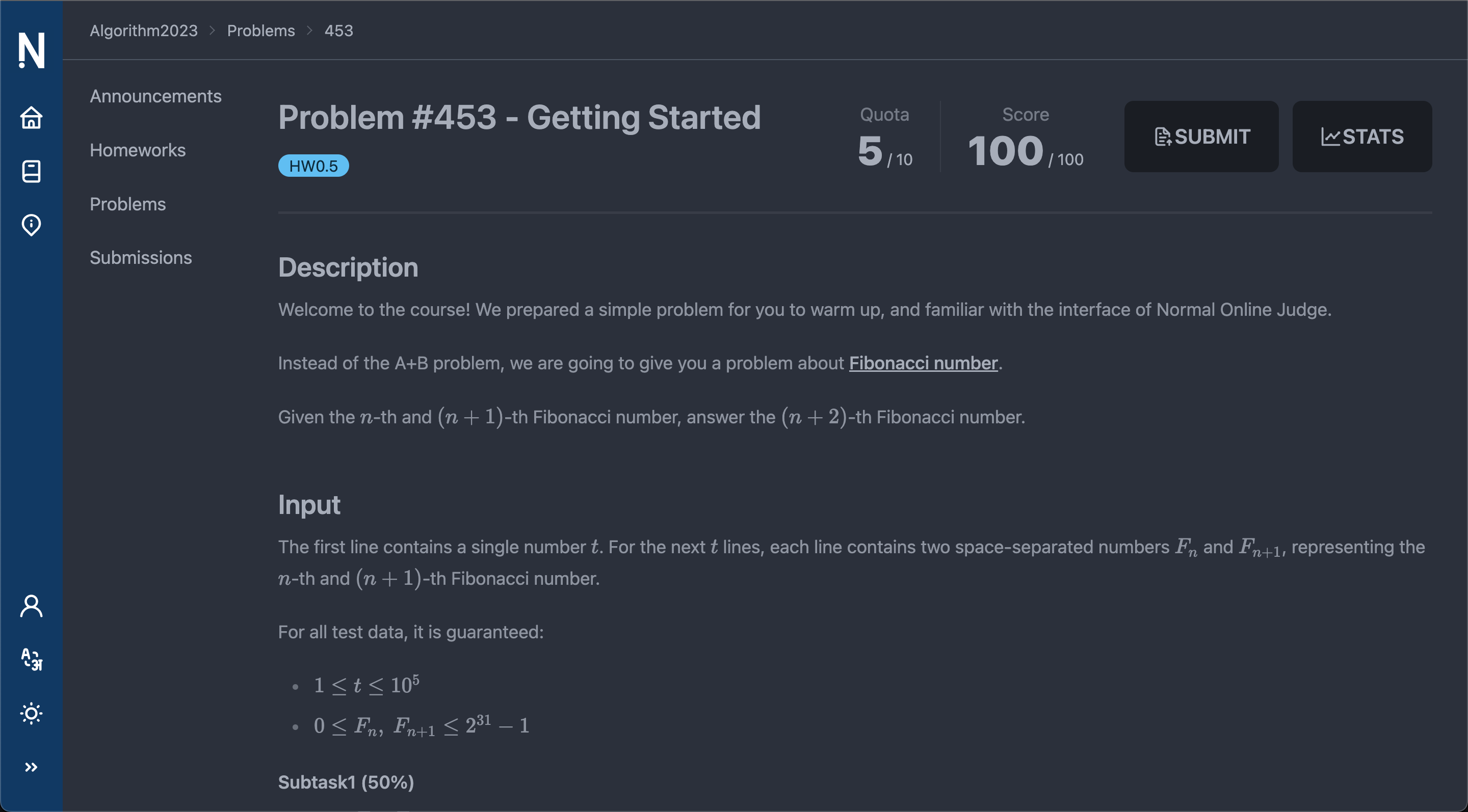 Our platform, Normal Online Judge (NOJ), is designed to provide easy-to-use web-based system that evaluates programming code submitted by users for departmental courses.