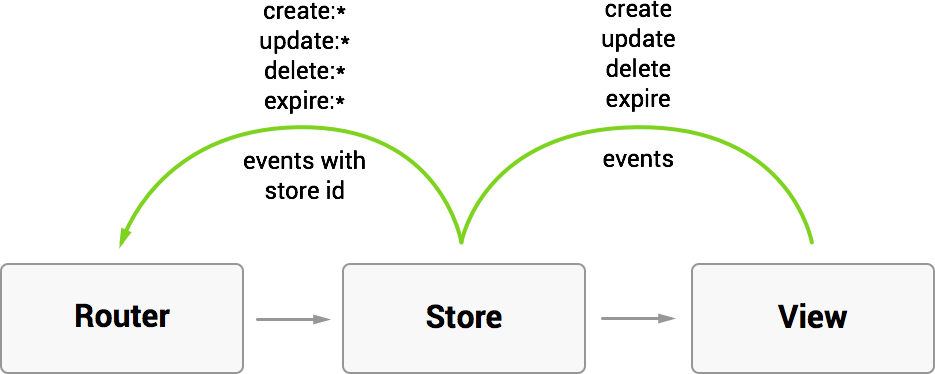 Views can trigger change events (create, update, delete or expire) with Store's dispatch method. Store delegates change event to corresponding store and invokes API request. When request is completed, Store triggers completion event (create:storeId, update:storeName, delete:storeName or expire:storeName).