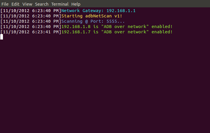 adbNetScan is a command line binary coded in C# that scans your network for any Android device that is "ADB over network" enabled. It scans port 5555, which is the default port. If you have device that listens on another port, I will try to add support for other ports.
