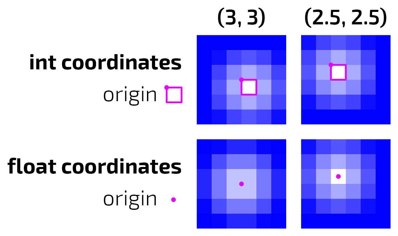 Therein lies the problem with the semantic meaning of a float versus an int. Consider this image of a #FFFFFF → #0000FF gradient starting at the top left corner and ending at the bottom right, at 300px² and at 6px². In the right image, the value of the highlighted pixel is—indeed—not #FFFFFF (it's #F1F1FF). In the left image, the highlighted 50px² square corresponds to the same area on the right image. The color at the center of that square is also #F1F1FF. If we wanted a pure white at that location, we would want to start at (25px, 25px) on the left and (0.5px, 0.5px) on the right. I think this change makes sense. Whether or not it's practical, however, is certainly up for consideration. I don't think I can be a good judge of that. |