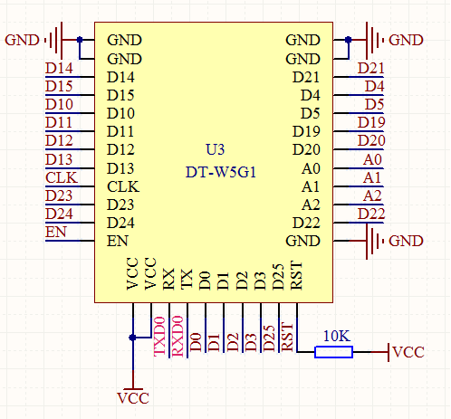 The core processor of DT-W5G1 module adopts ultra-low power processor and 2G-5G dual-frequency chip. The chip integrates 32-bit microcontroller with 16-bit streamlined mode and 160 MHz main frequency in smaller size package. DT-W5G1 has a complete Wi-Fi network function, which can be used as a slave plane and carried on other host MCUs. DT-W5G1 can be booted directly from external Flash when it responds alone. The built-in cache memory can improve the system performance and optimize the storage system. In addition, DT-W5G1 can be used as Wi-Fi adapter only through SPI/SDIO or I2C/UART, and should be applied to any microcontroller-based design.