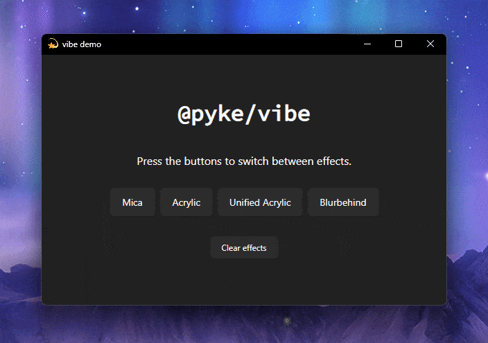 vibe is a library for acrylic/vibrancy effects for Electron on Windows 10/11. Any Electron version compatible with N-API v6 (Electron v11+) is supported.
