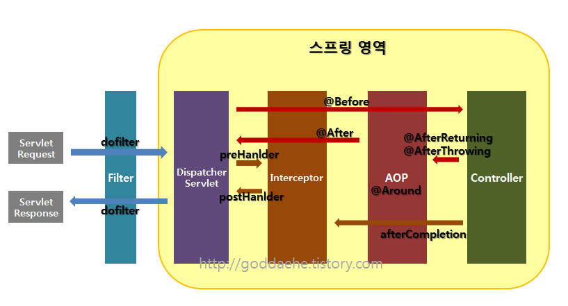 ㆍInterceptor와 Filter는 Servlet 단위에서 실행된다. <> 반면 AOP는 메소드 앞에 Proxy패턴의 형태로 실행된다.