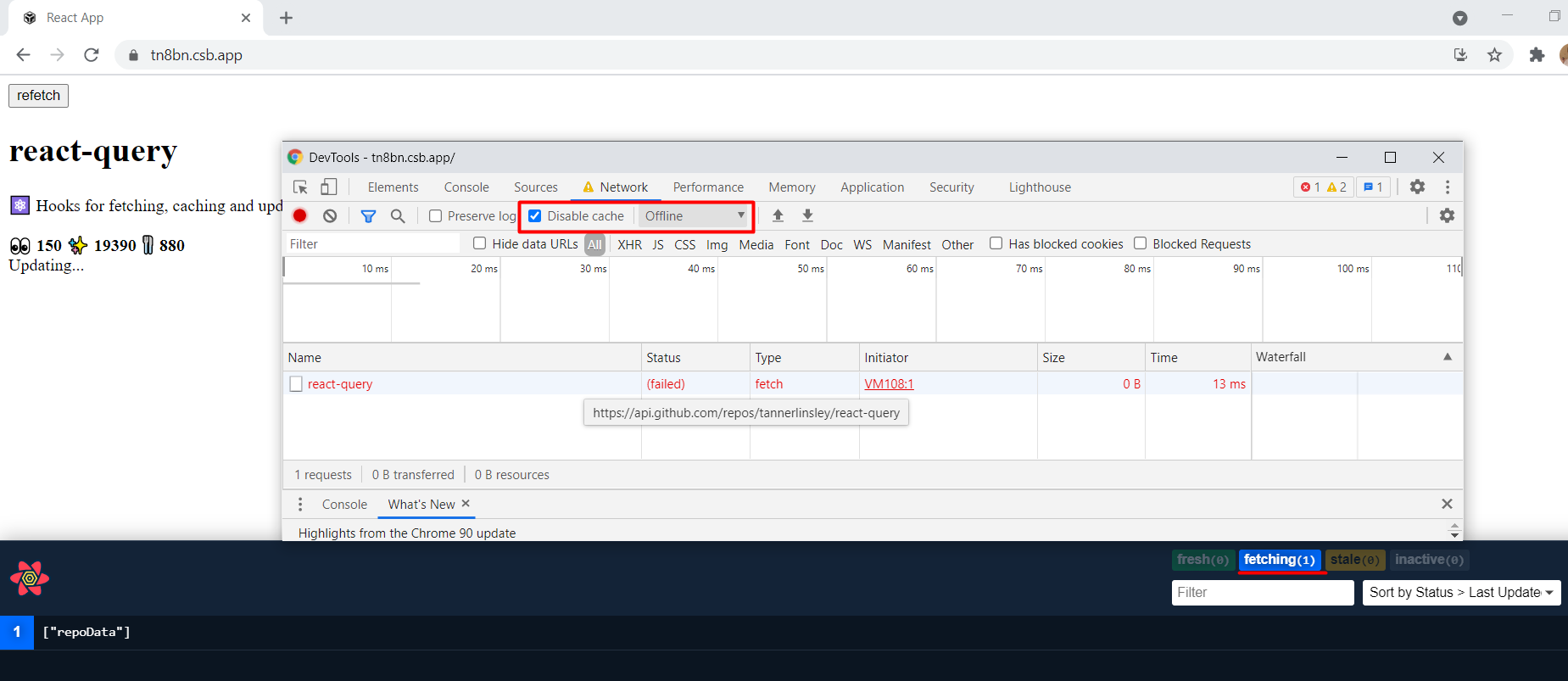 Query never goes into Error state if user is offline. Query is forever in Fetching state, which prevents me from showing an error.