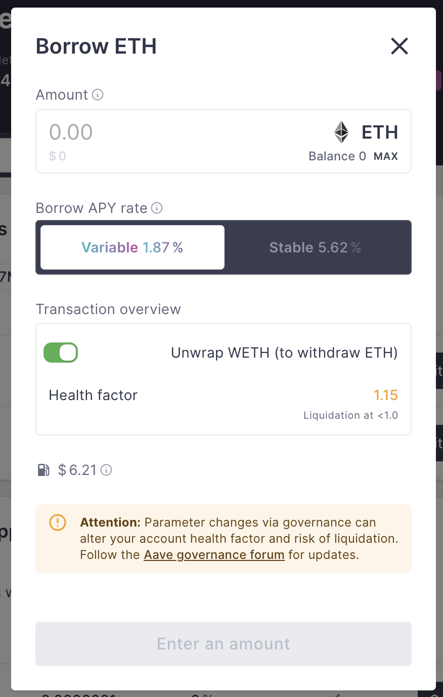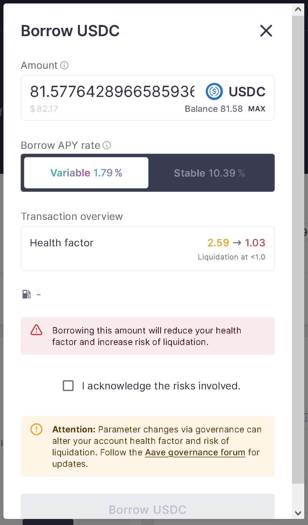 Adds a small warning to the borrow modal which reminds the user that governance can change parameters which can affect the health factor of their position and reminds them to keep an eye on the governance forum to stay ahead of such changes.