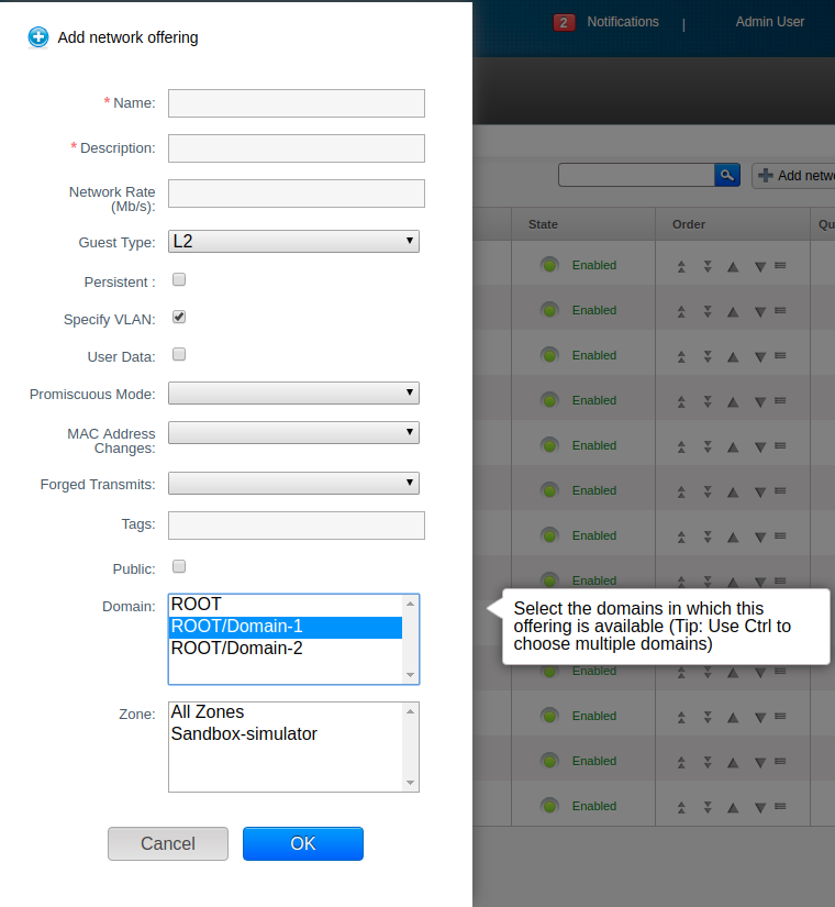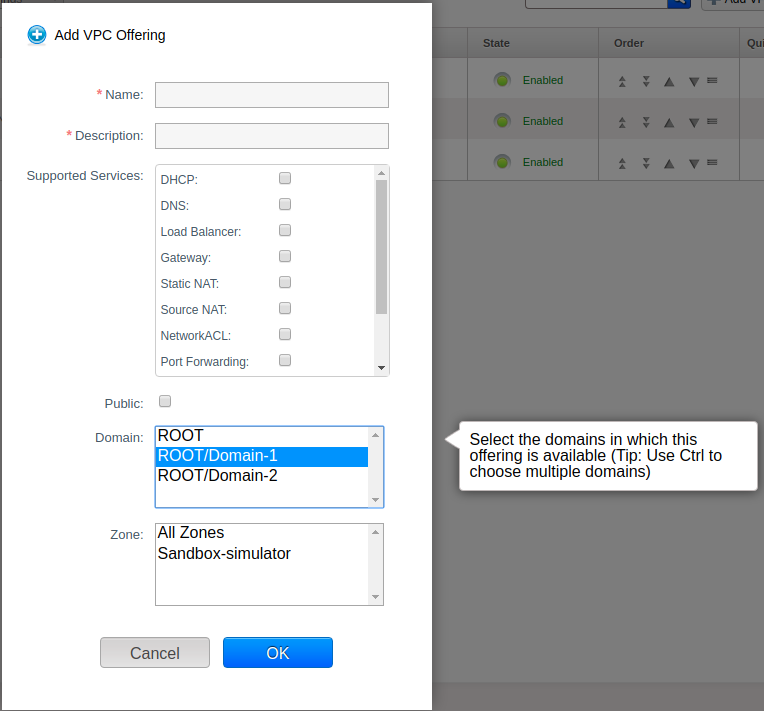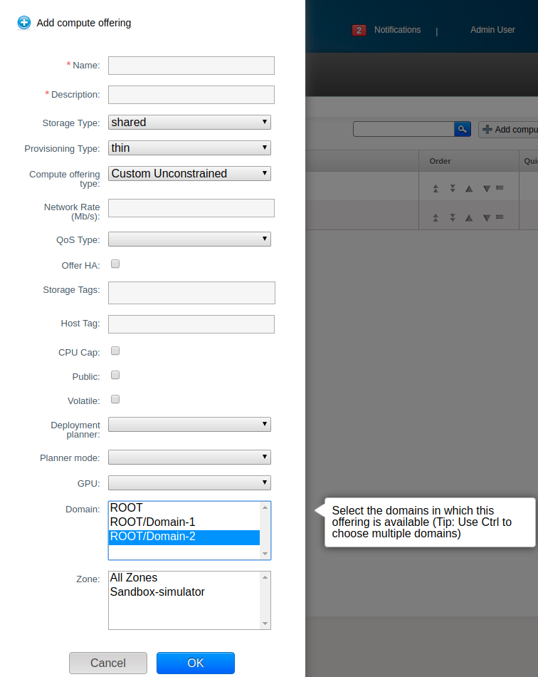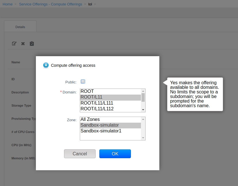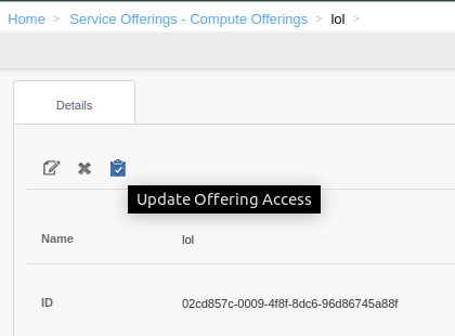 domainid=publiccan be passed in the API call. To make a zone specific offering available for all zones by root admin,zoneid=allcan be passed in the API call. Update Offering Access action has been added to the offerings page in UI which will allow updating linked domain(s) and zone(s) for an offering.Domain-admins can update compute and disk offerings. However, they can not change zones for the offerings specified for their domain or subdomains. They cannot change name, display text, sort-key for offerings specified for their domains/subdomains and also other domains which are not child domain for them. They can chnage domains(within their subdomains) for the offerings specified for their domains/subdomains.