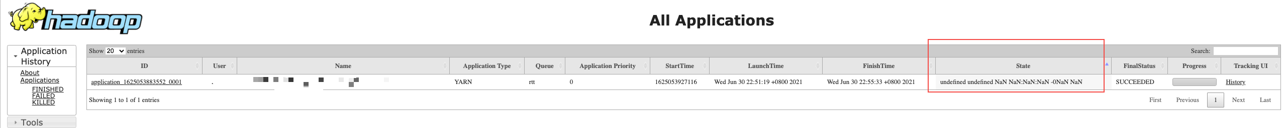 appsTableData [Array(13)] 0: Array(13) 0: "<a href='/applicationhistory/app/application_1625053883552_0001'>application_1625053883552_0001</a>" 1: “XXXXXXXXXX" 2: “XXXXXXXXXXXXX" 3: "YARN" 4: "rtt" 5: "0" 6: "1625053927116" 7: "1625064679564" 8: "1625064933490" 9: "FINISHED" 10: "SUCCEEDED" 11: "<br title='100.0'> <div class='ui-progressbar ui-widget ui-widget-content ui-corner-all' title='100.0%'> <div class='ui-progressbar-value ui-widget-header ui-corner-left' style='width:100.0%'> </div> </div>" 12: "<a href='http://node1:8088/proxy/application_1625053883552_0001/'>History</a>" length: 13 __proto__: Array(0) length: 1 __proto__: Array(0)after fix