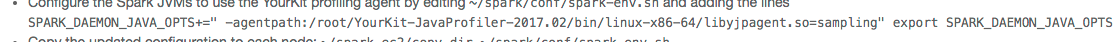 | SPARK_DAEMON_JAVA_OPTS+=" -agentpath:/root/YourKit-JavaProfiler-2017.02/bin/linux-x86-64/libyjpagent.so=sampling" | ||