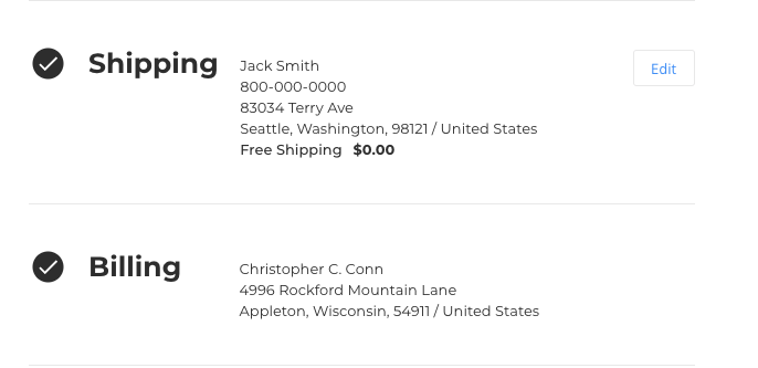 Thanks for addressing the feedback! Looking better! Just one outstanding question around syncing the billing address to the API with the same information that the API actually returned.