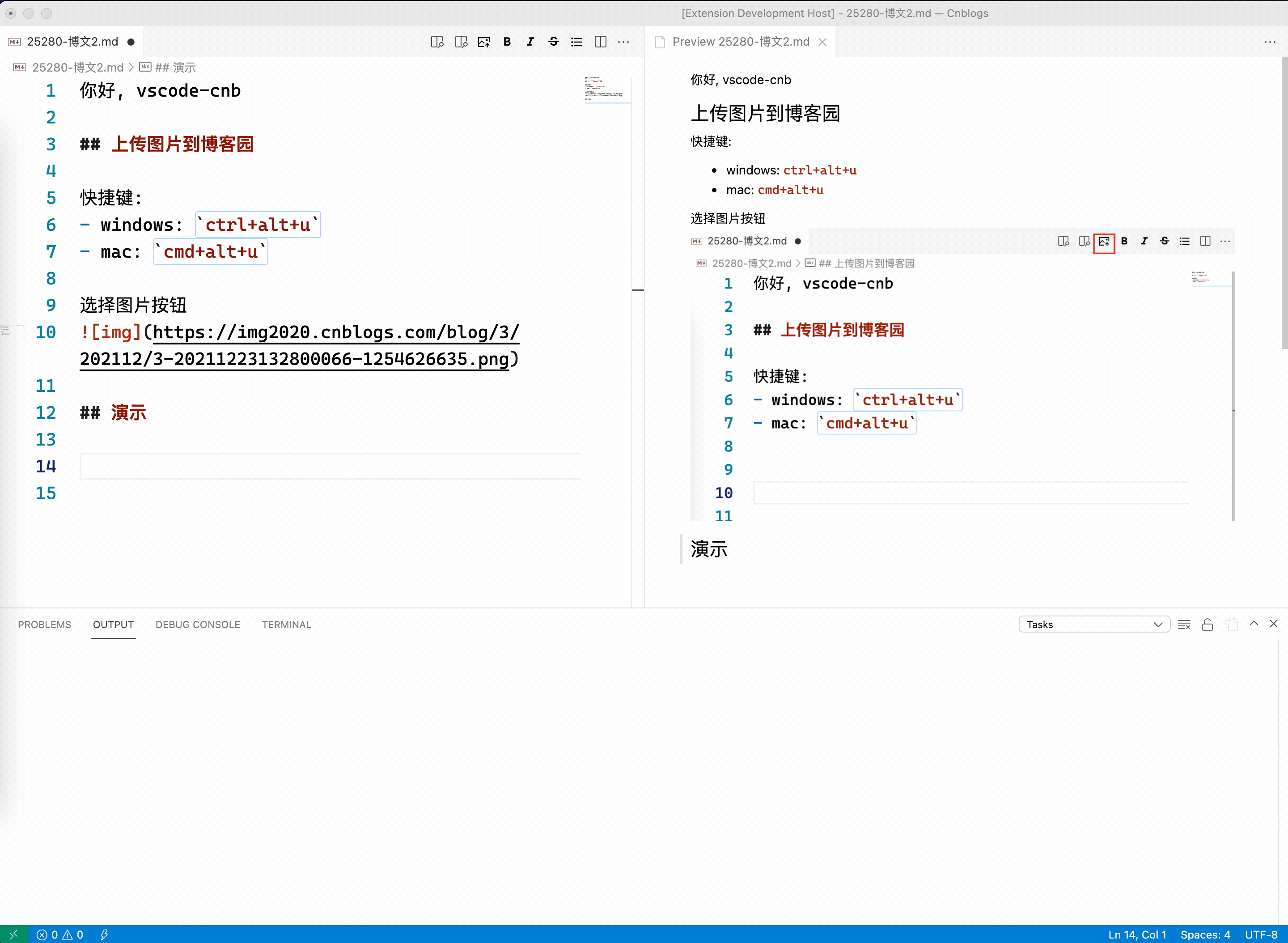当 VSCode 处于配置好的 vscode-cnb 工作空间时,可以通过快捷键,上下文菜单,编辑器工具栏等方式上传本地或剪贴板中的图片到博客园。