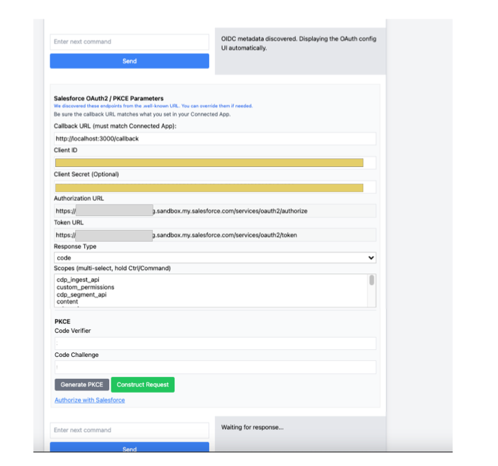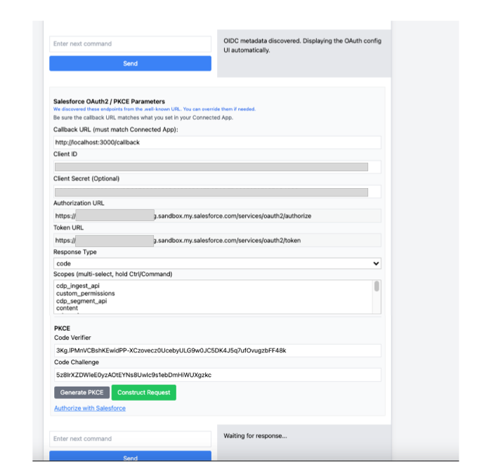 4. Click "Construct Request" and follow the link "Authorize with Salesforce" to authenticate and return to the callback URL (this app listens for http://localhost:3000/callback, this must match your Connected App config. See bottom Set-up.)