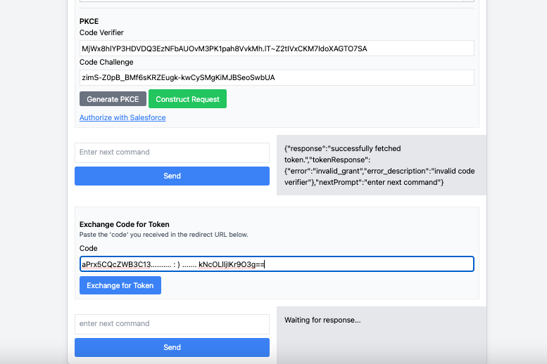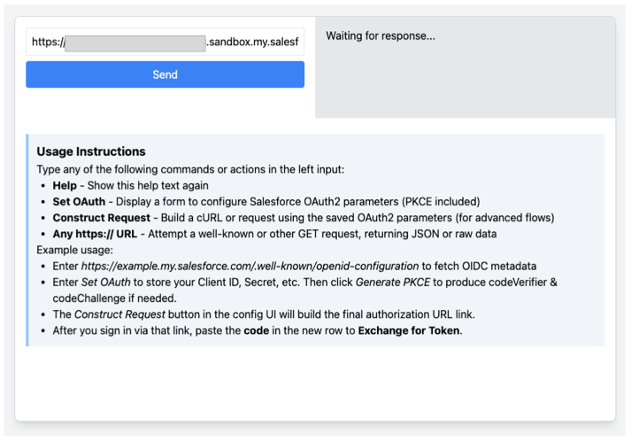 This tool provides an interactive web interface and backend service (running on port 3000) to help you quickly validate OIDC metadata, construct authorization requests with PKCE support 😲, and exchange authorization codes for tokens. The easily extendable, one-page frontend, styled with Tailwind CSS <-- communicates bidirectionally without needing to adhere to http timeouts --> with the backend via WebSocket, making it easy to see responses in real-time while keeping data private.