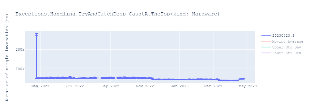 | ThrowAndCatchDeepRecursive - Duration of single invocation | 11.77 μs | 12.63 μs | 1.07 | 0.07 | False | |||||