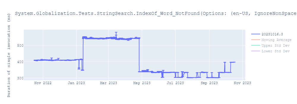 IsRegressionStdDev: Marked as regression because -541.6462419762796 (T) = (0 -397.14839198810546) / Math.Sqrt((0.03434102539005903 / (14)) + (0.1773053449286112 / (16))) is less than -2.048407141790485 = MathNet.Numerics.Distributions.StudentT.InvCDF(0, 1, (14) + (16) - 2, .025) and -0.18858880117623114 = (334.1343882721141 - 397.14839198810546) / 334.1343882721141 is less than -0.05.