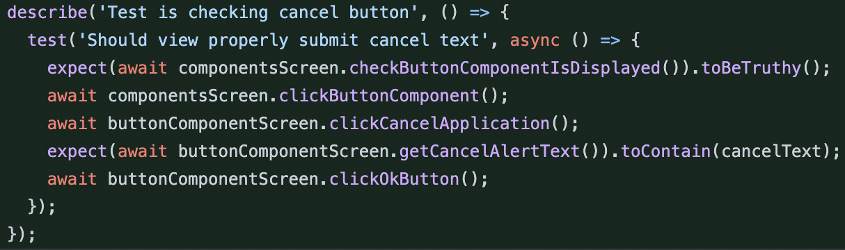 The basis here lets the test runner navigate, check for existence of controls/text. But I think the more valuable bits are understanding the impact a props, etc has on the native component. Either visually via screenshot testing, or via approaches like snapshotting the native component tree.