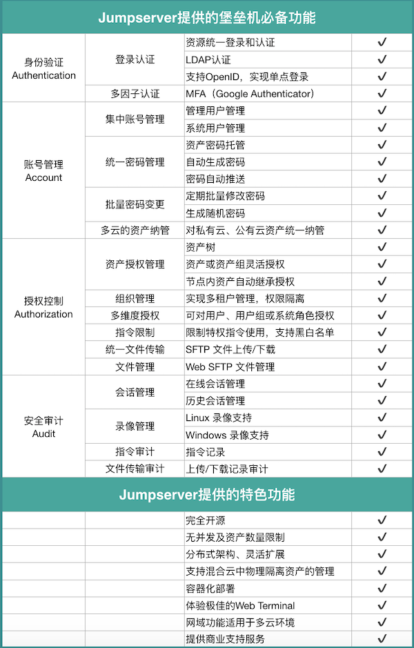 Jumpserver是全球首款完全开源的堡垒机,使用GNU GPL v2.0开源协议,是符合 4A 的专业运维审计系统。