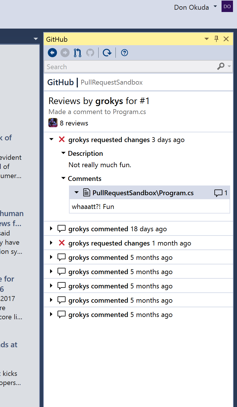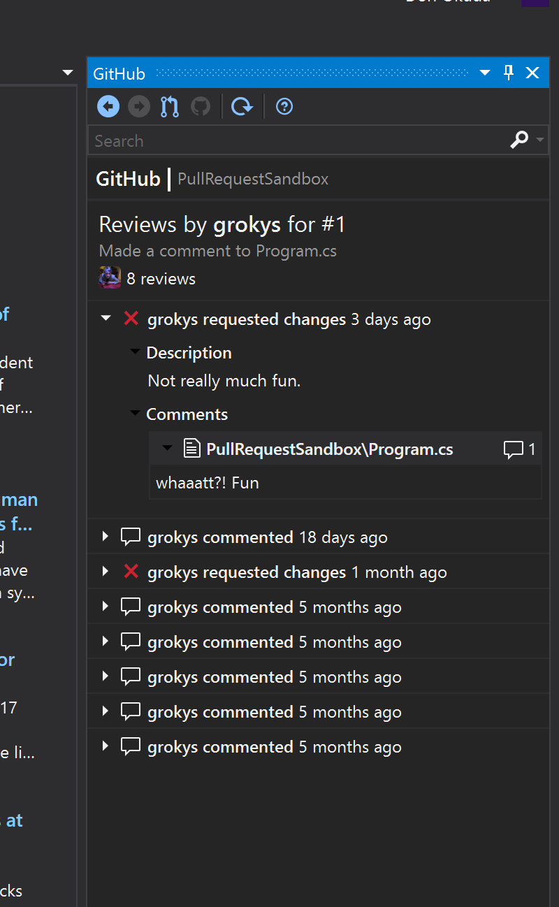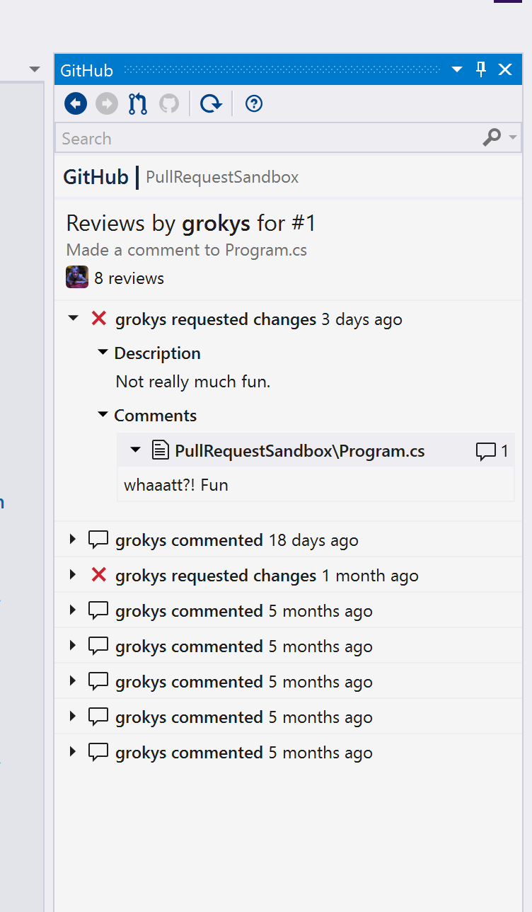 ok, I'm going to take a step back from this pull request for real 😛 One thing I'm stuck on and could use some guidance is how to change the expander arrow/triangle to the default version that (I assume) we get from Visual Studio: I believe the ones we use here are the triangle down octicons But I'd rather use the ones we see in the headers for each section (next to "Description," "Reviewers," etc) By using the default expander triangle, we'll fit better with the Visual Studio UI brand. Also hoping it's less code to maintain in the long run 🤞 |