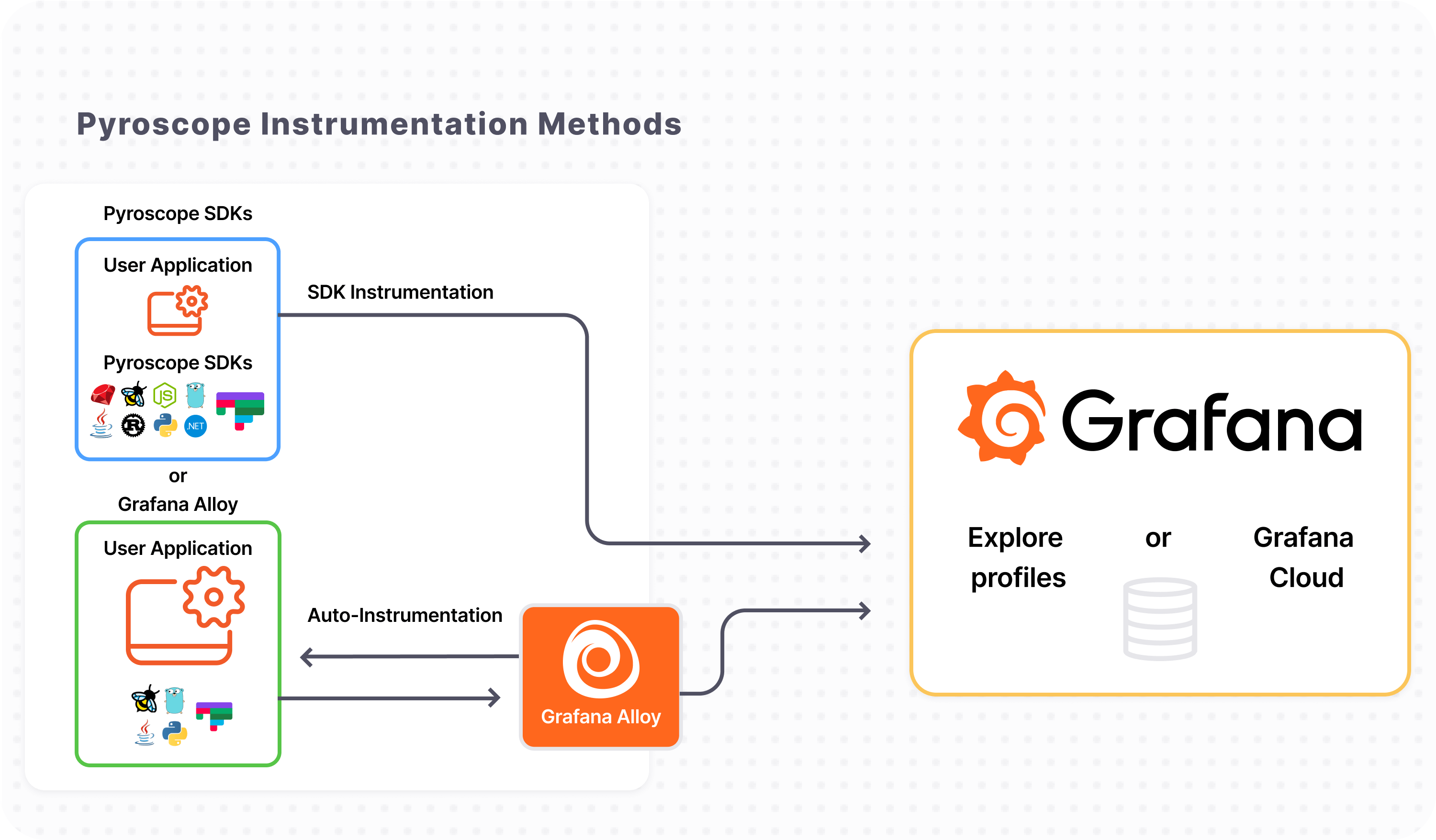 • Pyroscope SDKs(push) or Grafana alloy(pull) : The client-side part of Pyroscope that collects profiling data from your applications and sends it to the server.