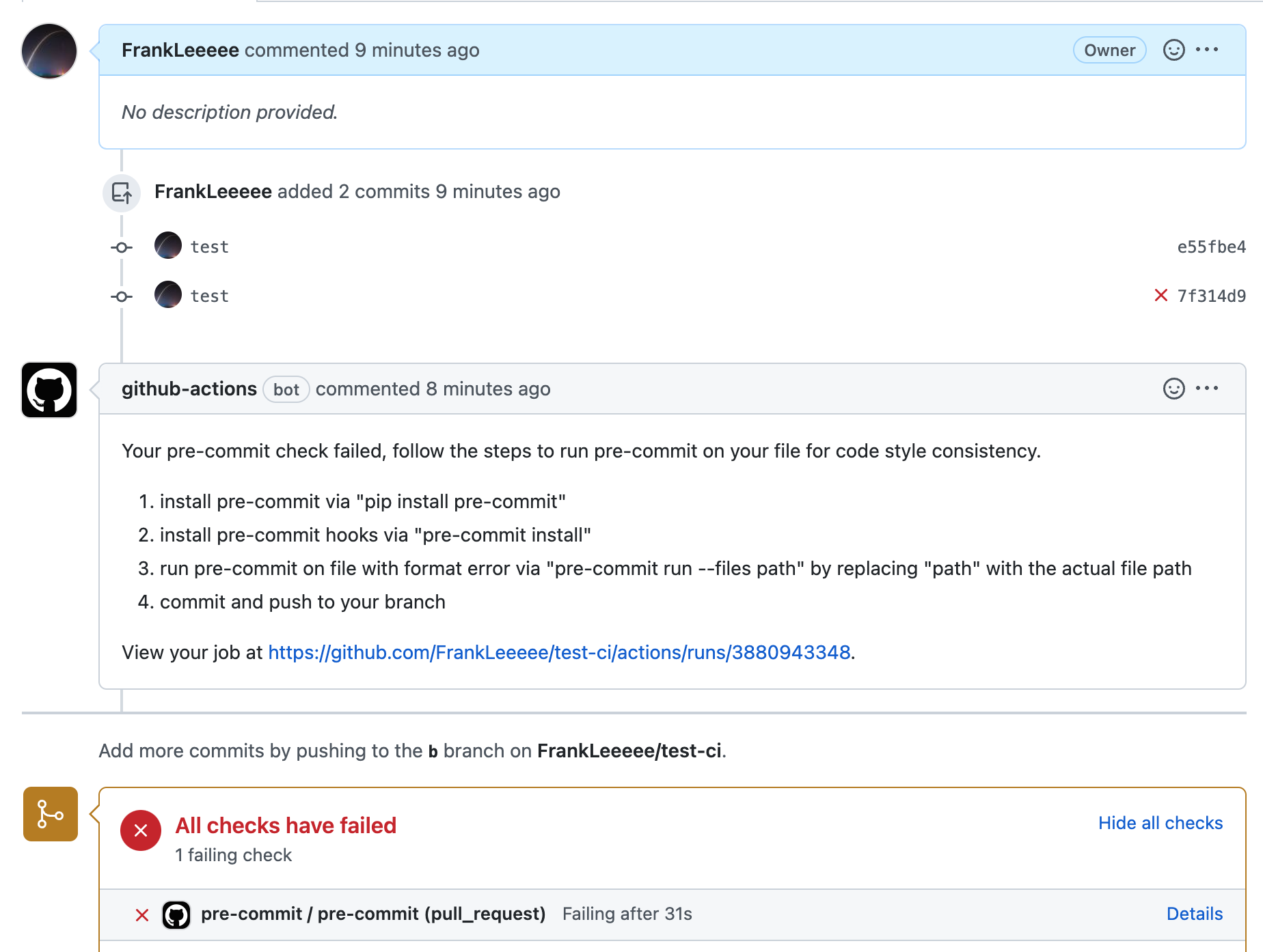 As we have added pre-commit checks on the changed files, we should tell the contributor how to fix the format if the pre-commit check is not passed. This PR added a workflow file which will be triggered if the pre-commit workflow fails and post a comment to the PR automatically.