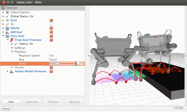 Actions can be previewed with the free_gait_rviz_plugin. It takes the current state of the robot and visualizes the motion based on the defined action. This RViz plugin allows to scrub through time and visualize footholds, trajectories, support polygons etc.