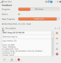 Once actions are being executed by the Free Gait action server, the rqt_free_gait_monitor shows the progress of the execution and allows to pause and stop the active action.