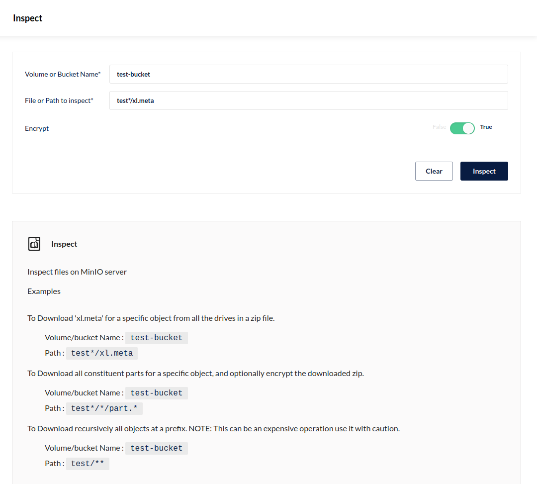 Just a note of caution, don't run this over minio not distributed, will fail Also, tested directly with mc command to learn: cniackz:/Users/cniackz/test-bucket # mc admin inspect myminio/test-bucket/file.txt/xl.meta