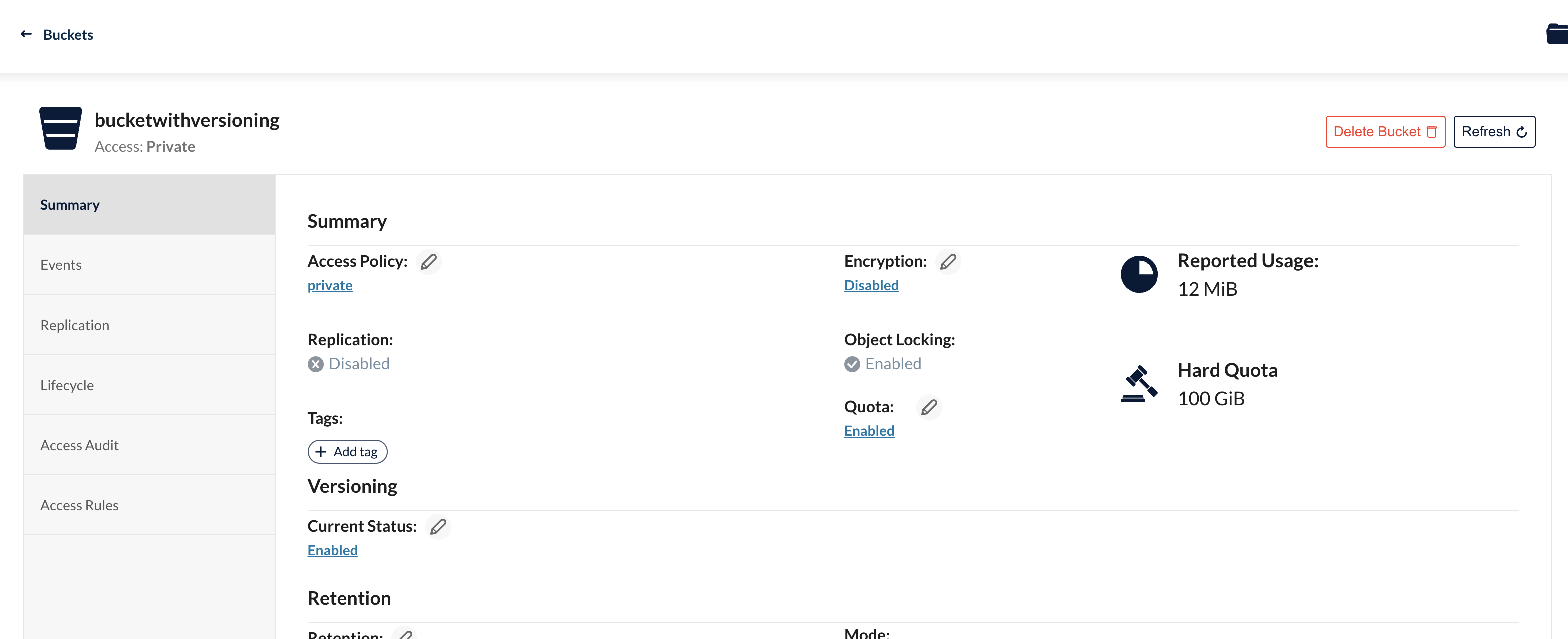 Applied some changes in versioning section for bucket details page. (Removed quota from that section & moved into summary)