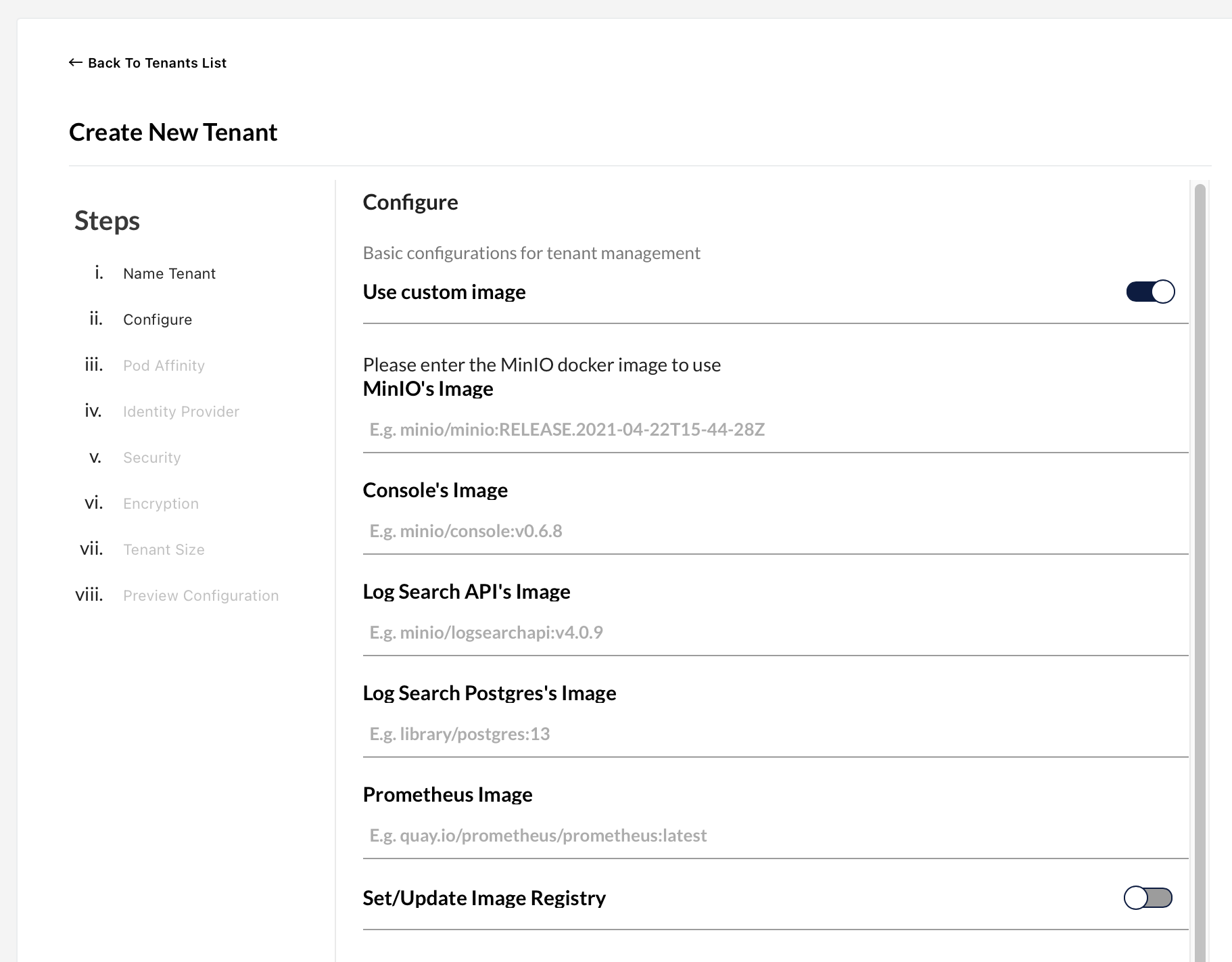 Three new fields were added to let users customize the docker images for log search and prometheus