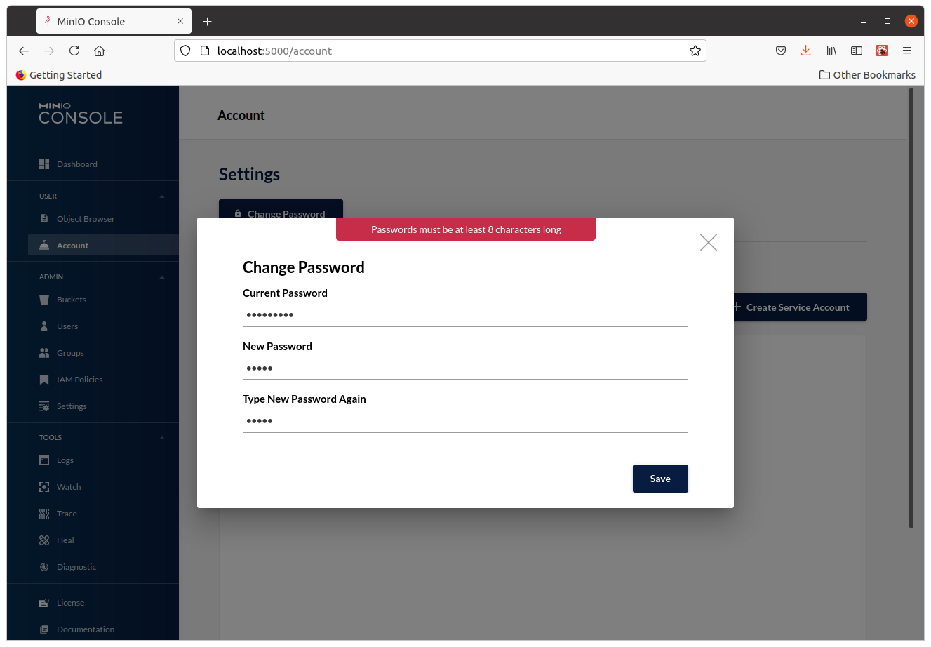 Password length checking with error message added to ChangeUserPassword, AccountChangePassword and AddUser modals