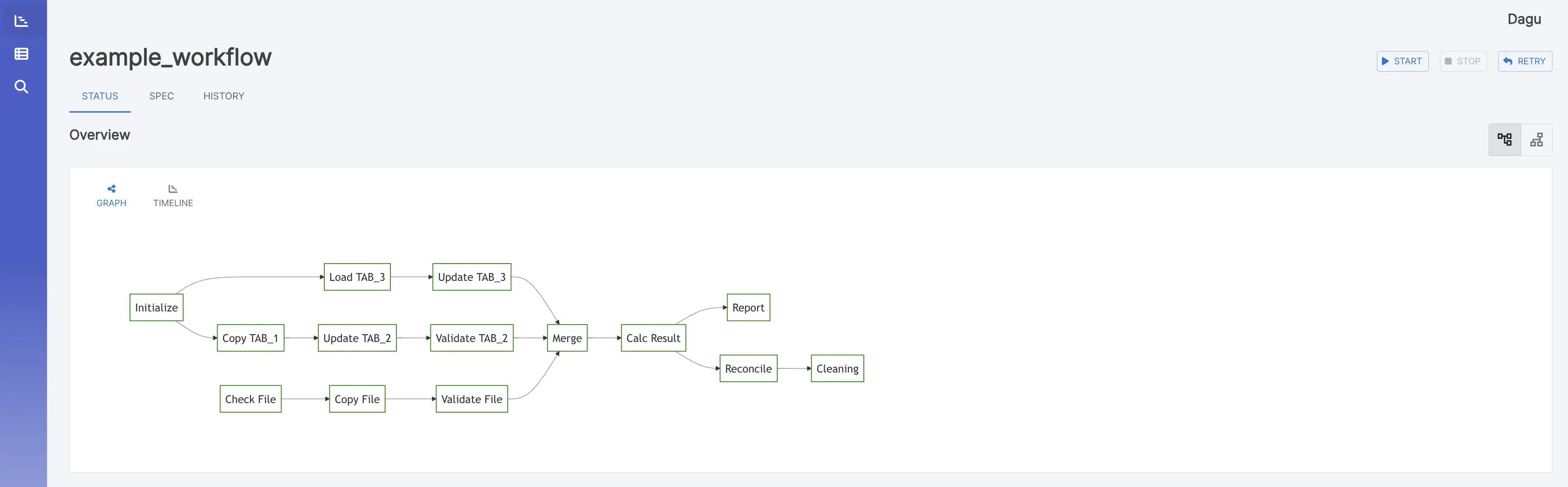 - send_reportLegacy systems often have complex and implicit dependencies between jobs. When there are hundreds of cron jobs on a server, it can be difficult to keep track of these dependencies and to determine which job to rerun if one fails. It can also be a hassle to SSH into a server to view logs and manually rerun shell scripts one by one. Dagu aims to solve these problems by allowing you to explicitly visualize and manage pipeline dependencies as a DAG, and by providing a web UI for checking dependencies, execution status, and logs and for rerunning or stopping jobs with a simple mouse click.