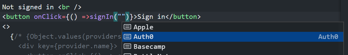 onClick), but that means that the signin/signout functions are actually being called with the event object. So what should we type this? Right now I have it as an overloaded function, which allows bothonClick={signIn}andonClick={() => signIn()}as well as provides intellisense on the available providers for the first argumentWhy convert to typescript?