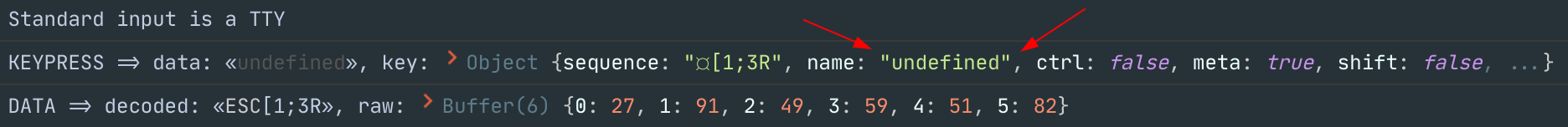 console.log('KEYPRESS => data: «%o», key: %o', escapeEsc(str), key);
