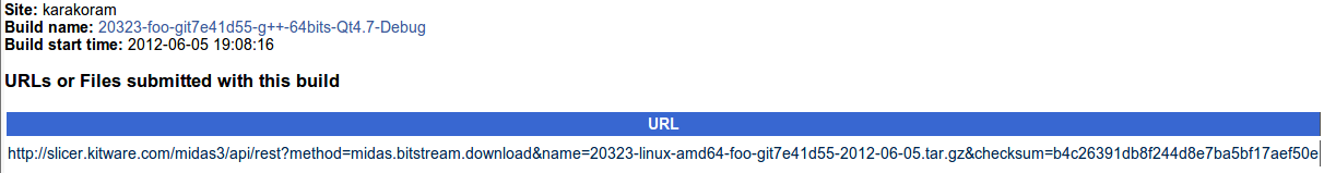$ cd SlicerExtensionsCustomIndex-build $ cd foo-build $ cmake -DMIDAS_PACKAGE_URL:STRING=http://slicer.kitware.com/midas3 \ -DMIDAS_PACKAGE_EMAIL:[email protected] \ -DMIDAS_PACKAGE_API_KEY:STRING=a0b012c0123d012abc01234a012345a0 . $ make ExperimentalUpload