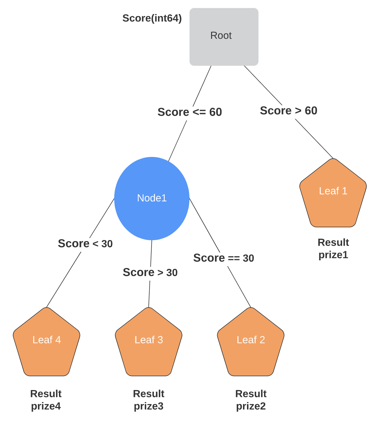 modifiedTree := []byte(`{"nodes":[{"preProcessFnName":"","id":0,"parentId":-1},{"preProcessFnName":"","id":2,"parentId":0,"comparer":{"type":"lt","equal":true},"valueToCompare":{"Value":60,"Type":"int64"}},{"preProcessFnName":"","id":1,"parentId":0,"comparer":{"type":"gt","equal":false},"valueToCompare":{"Value":60,"Type":"int64"},"result":{"Value":"prize1","Type":"string"}},{"preProcessFnName":"","id":3,"parentId":2,"comparer":{"type":"eq"},"valueToCompare":{"Value":30,"Type":"int64"},"result":{"Value":"prize2","Type":"string"}},{"preProcessFnName":"","id":4,"parentId":2,"comparer":{"type":"gt","equal":false},"valueToCompare":{"Value":30,"Type":"int64"},"result":{"Value":"prize3","Type":"string"}},{"preProcessFnName":"","id":5,"parentId":2,"comparer":{"type":"lt","equal":false},"valueToCompare":{"Value":30,"Type":"int64"},"result":{"Value": 420,"Type":"int64"}}],"name":"simpleTree"}`)