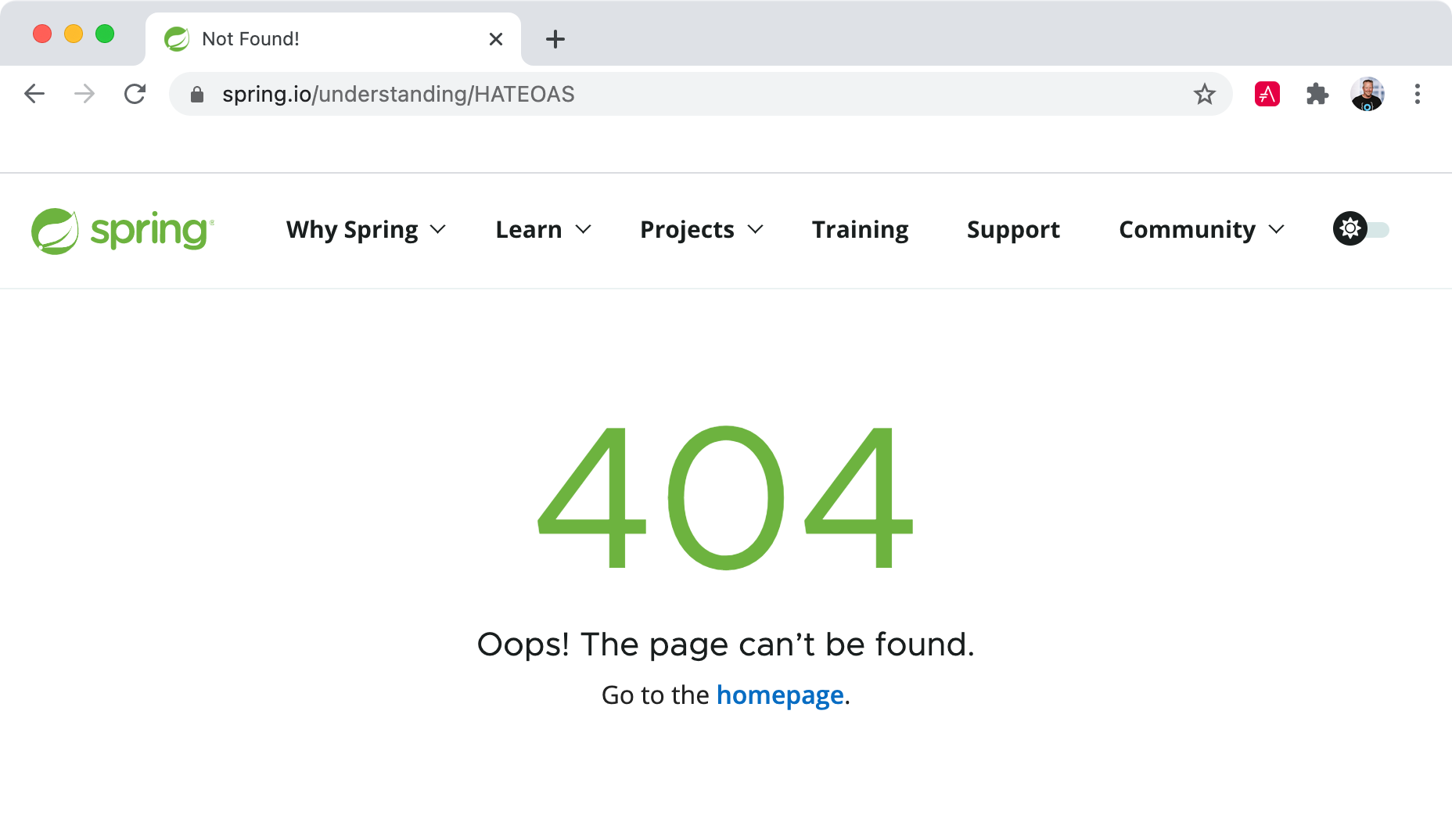 Go to https://docs.spring.io/spring-data/rest/docs/current/reference/html/#repository-resources.resource-discoverability, and click on the [HATEAOS](https://spring.io/understanding/HATEOAS) link. It results in a 404. <img width="928" alt="Screen Shot 2021-01-26 at 12 54 52 PM" src="https://user-images.githubusercontent.com/17892/105897660-b0929000-5fd5-11eb-8ab3-c8ef98e8053c.png">