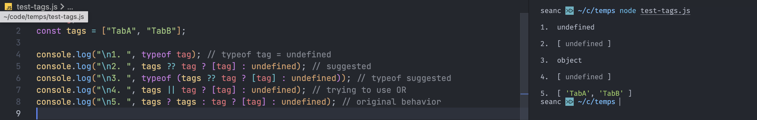 @jlalmes Houston we have a problem. Things get weird with the nullish coalescing operator. EDIT: Just realized the first line is covered. 1. let tag; |