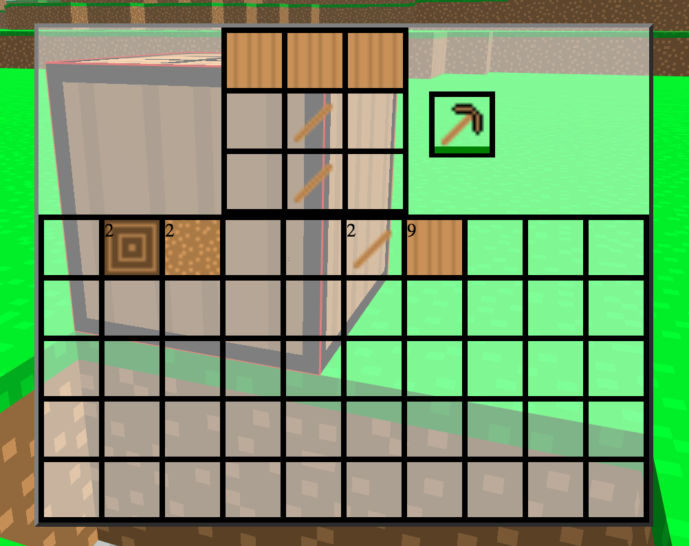 To start out, acquire wooden logs, craft into planks, craft two planks into sticks, then craft a pickaxe as follows, in a voxel-workbench: