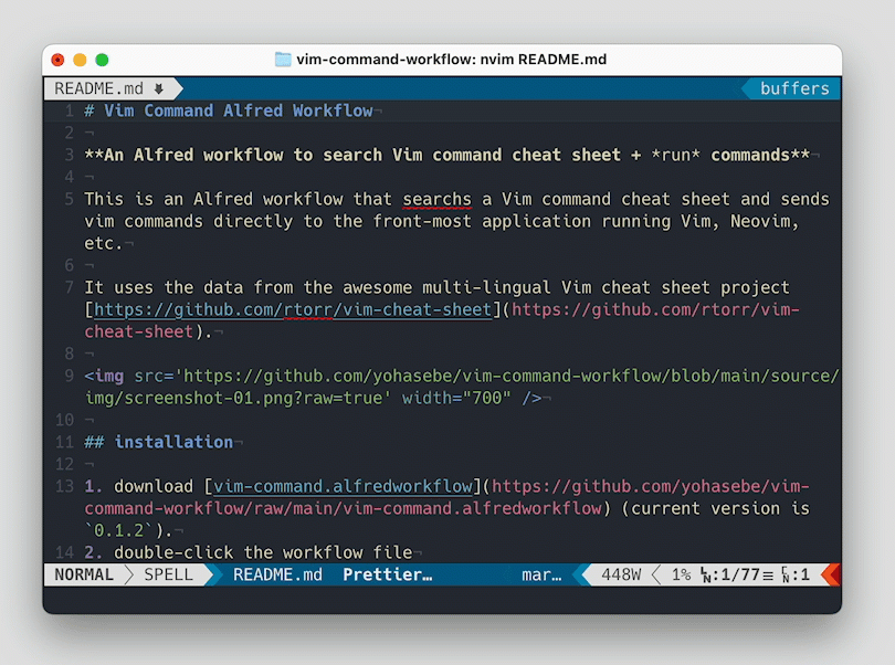 This is an Alfred workflow that searches a Vim command cheat sheet and sends vim commands directly to the front-most application running Vim, Neovim, etc.